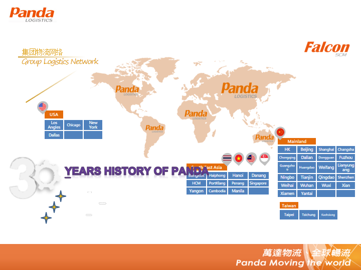 FALCON万通运达国际货运代理有限公司于2008年创建于闽海之滨-厦门,隶属(PANDA GROUP),集团成立于1989年4月,迄今集团人数超4800人,全球130家全资子公司,400余家代理, 业务范围涵盖国际海空运,仓储,跨境电商FBA物流,进出口贸易代理等贸易全产业链服务,目前集团已经是全球顶级物流承运商。集团网址:www.pandalog.com