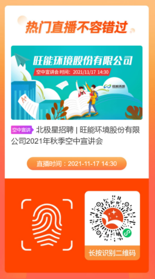 【旺能环境股份有限公司】开启“2021年秋季校园空中宣讲会”,将以直播的形式直播招聘,欢迎广大应届生参加我们的空中宣讲会